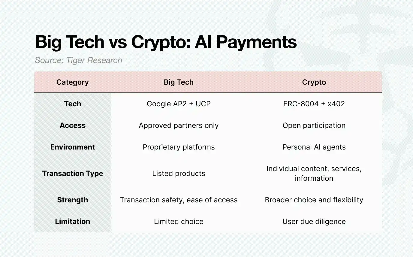 大科技公司和加密领域都在追求同一个目标:实现自主的 AI Agent 商业。区别在于架构:大科技公司青睐封闭、受控的系统,而加密领域则推进开放、基于协议的模型。