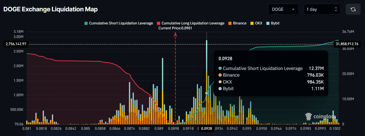 目前,下行方向的 $0.0892 和上行方向的 $0.0928 是交易者過度槓桿的兩個主要水平,分別累積了價值 $4.13 百萬的多頭持倉和 $12.37 百萬的空頭持倉。