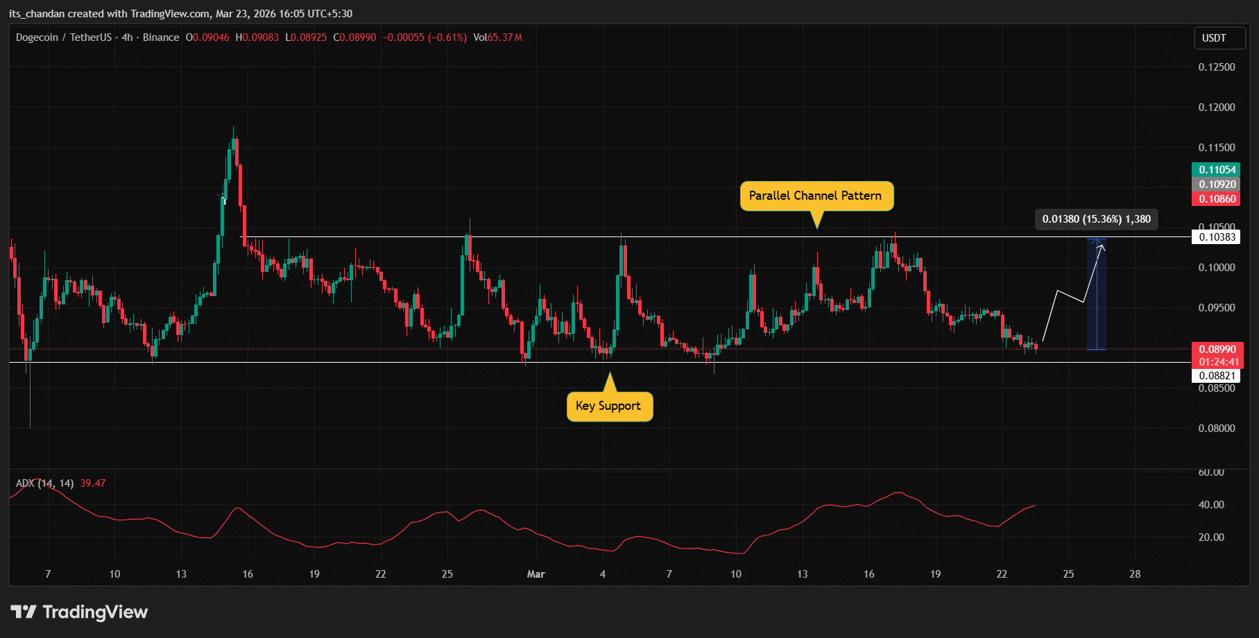 Dogecoin 的四小時圖表顯示,這枚迷因幣持續在 $0.088 至 $0.10383 之間的長期平行通道模式內交易。自 2026 年 2 月下旬以來,這枚迷因幣一直在此區間內波動。