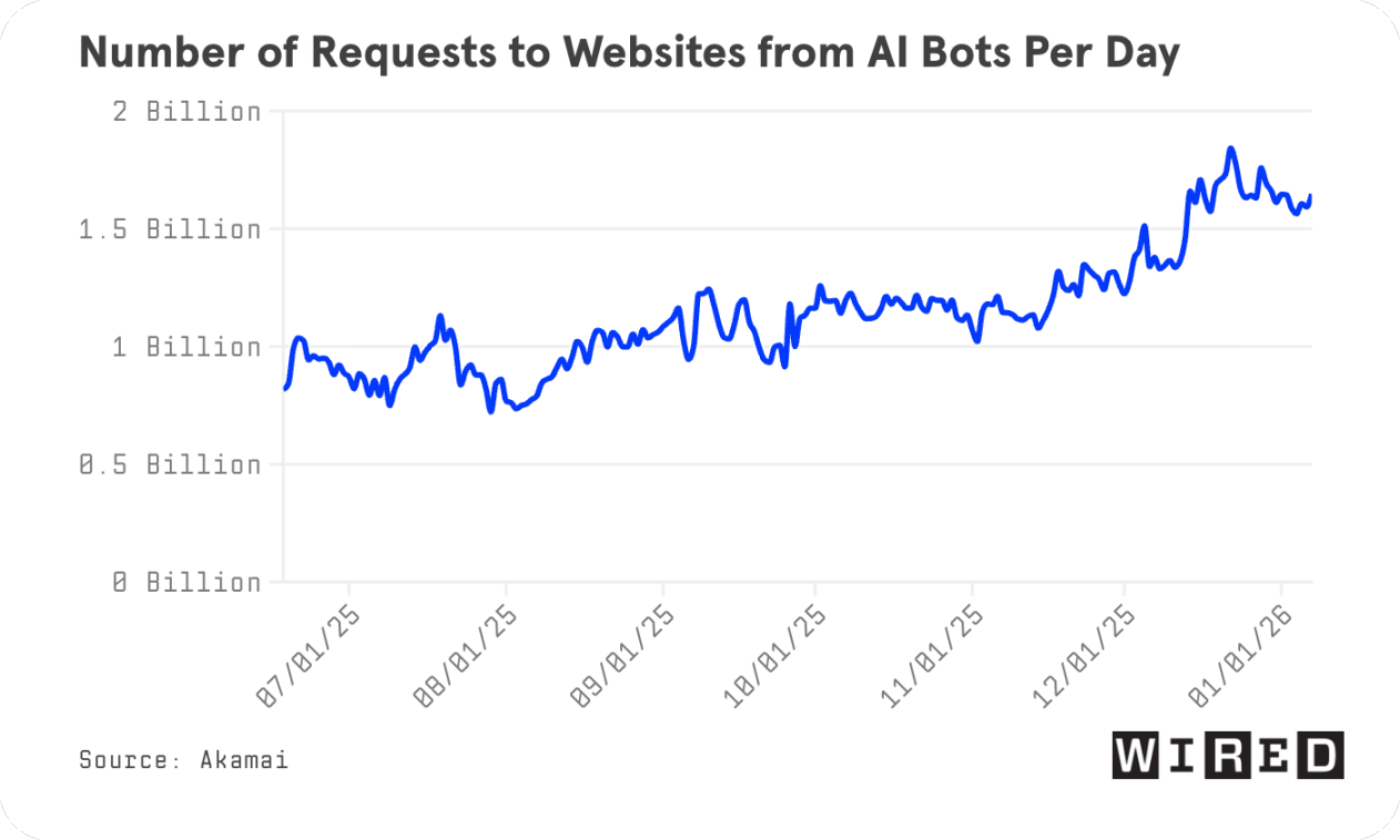 2024 年至 2025 年,維基百科的流量因爬蟲暴增 50%,伺服器壓力龐大、成本急升。其至少 65% 的高耗能請求均來自機器人。2025 年 2 月,圖片網站 DiscoverLife 每天遭受數百萬次爬蟲請求轟炸,網站幾近癱瘓。8 月,雲服務商 Fastly 報告,有機器人以每分鐘 39000 次的頻率請求某網站。開放獲取期刊目錄 DOAJ 也遭遇類似情況,並稱這波爬蟲潮「相當於功能性拒絕服務攻擊」。11 月的某一天,其流量同比暴增 968%。