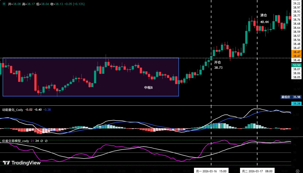 • 開倉決策:本次開倉決策基於對上漲中樞 B 完成後趨勢延續的預判。具體觸發信號為價格有效突破中樞上軌阻力(約 38.54 美元),且價差與動能兩大量化模型發出看漲共振信號,多重依據疊加顯著提升了入場時機的可靠性。據此,我們於 38.73 美元執行了 30% 倉位的多單開倉。