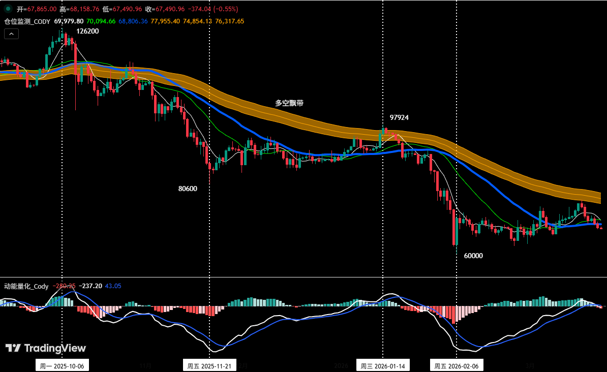 • 開倉:當幣價反彈至 69,500~71,500 美元區間觸發受阻信號,並結合模型頂部信號,可建立 15% 空頭倉位。