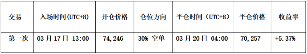• 開倉:當幣價反彈至 76,000 美元附近受阻時,價差交易模型同步觸發強烈頂部預警信號(圖中綠點),並與動量量化模型形成沽空共振。兩大模型信號高度一致,頂部壓力特徵明確。基於此信號疊加,我們於 74,246 美元建立 30% 空頭倉位,進場依據充分。