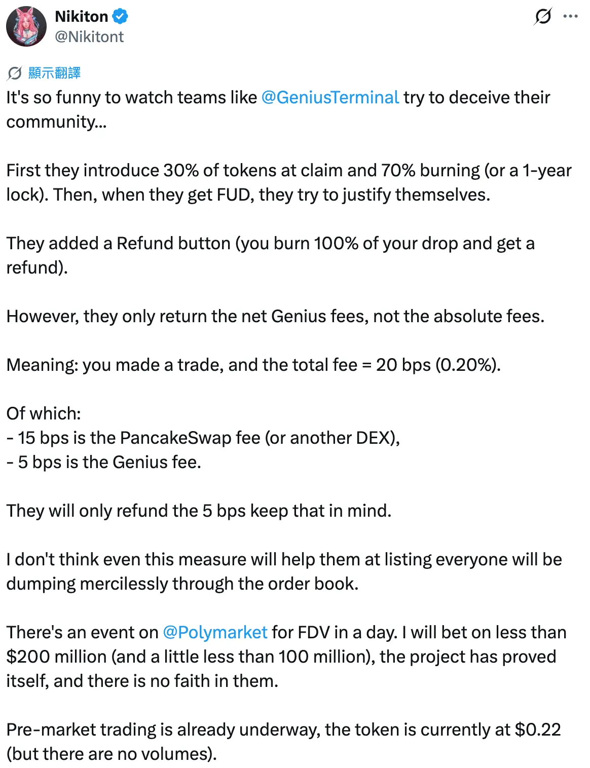 甚至在 Polymarket 上,已有用户开始押注 Genius 上线后的 FDV 将低于两亿美元,反映出市场对这次 TGE 操作已失去信心。