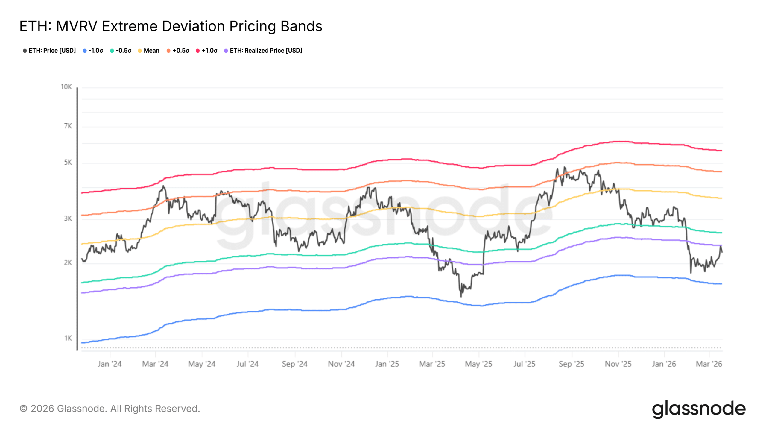 同時,價格與實現價格及 -0.5 MVRV 帶密切互動,該區域歷史上曾標示平均持倉者出現深層未實現虧損,並預示世代性底部。