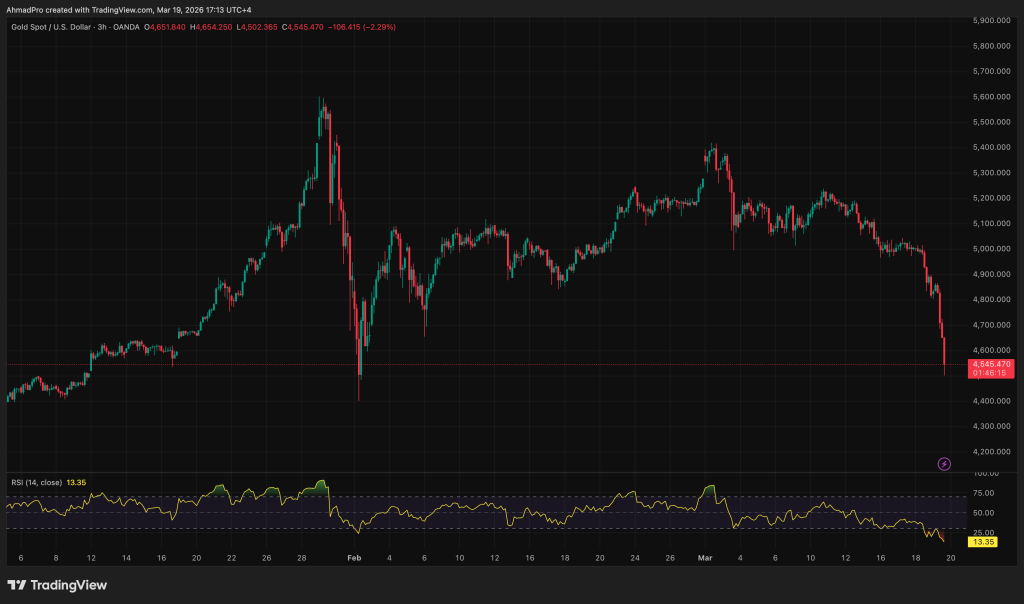 黃金現正交易於約 $4,500。技術上超賣,但未見反彈影線,空方仍掌握主導權。