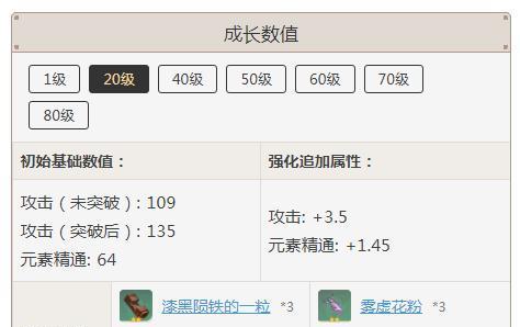 6.第一阶段突破材料:饰铁之花的第一阶段突破需要使用1个饰铁之花和3个白铁矿来升级。这个等级相对较低,但是对于新手玩家来说还是比较有用的。