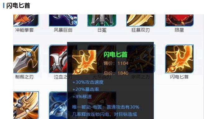 在游戏中,后羿的攻击速度极高,因此选择「闪电匕首」可以提升后羿的持续输出能力。该装备不仅可以增加后羿的攻击速度,还能带来额外的群体伤害效果,让后羿在团战中发挥更大的作用。