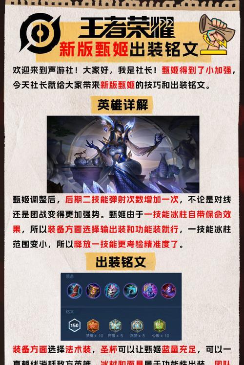 甄姬作为王者荣耀中的一名法师英雄,拥有着出色的控制能力和爆发伤害,是很多玩家喜欢选择的英雄之一。然而,要想在游戏中充分发挥甄姬的实力,合理的铭文搭配和装备选择是至关重要的。本文将为大家详细介绍甄姬上分的铭文出装攻略,帮助玩家提升游戏实力,轻松上分。
