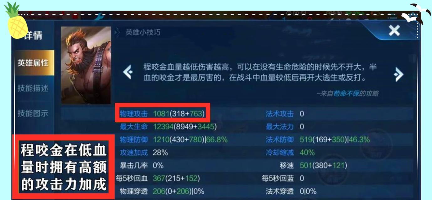 装备搭配介绍:不死鸟之眼和无尽战刃是程咬金的全面进化装备组合,它们能够提供程咬金所需的大量生命值、物理攻击和暴击率属性,并且拥有强大的被动技能,让程咬金在战斗中全面进化。
