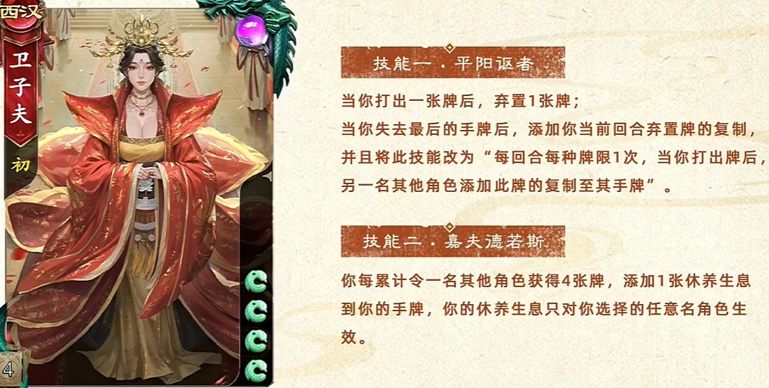 名将杀卫子夫技能是什么,卫子夫属于策略型辅助武将,适合配合手牌流阵容,卫子夫在《名将杀》中拥有“嘉夫德若斯”“平阳讴者”等技能,其机制围绕“手牌复制”“支援队友”展开。