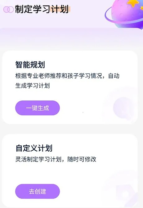 豆伴匠app怎么使用,用户在购课后可以进行学习计划的制定,在学习页面点击新建,然后用户就可以选择智能定制或者自定义啦,选择好之后就可以填写孩子的教育信息,如果选择的是智能定制,按照课程直接就能生成,如果选择自定义用户需要选择好日期以及学习日,添加好课程点击生成即可。