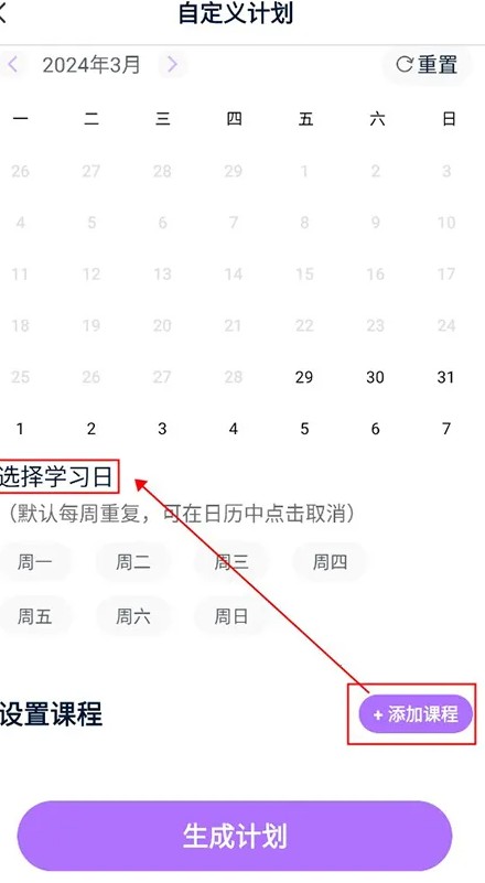 4、如果选择的是智能定制,按照课程直接就能生成,如果选择自定义用户需要选择好日期以及学习日,添加好课程点击生成即可。