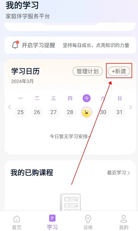 1、用户在购课后可以进行学习计划的制定,在学习页面点击新建。