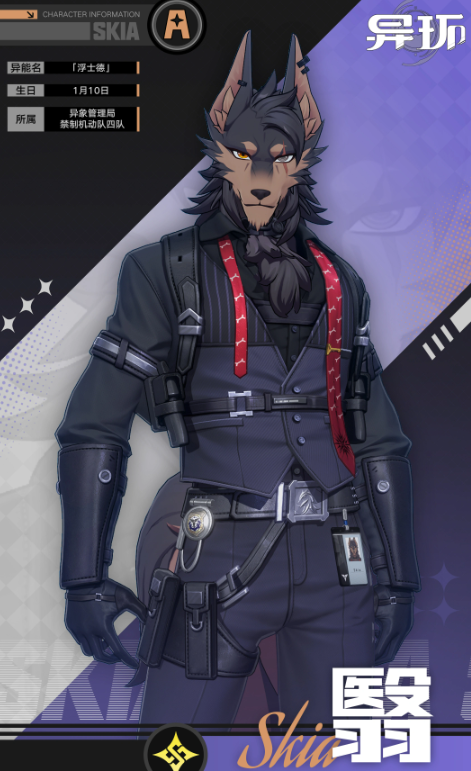 翳为影系机制驱动的高机动近战角色,外观呈狼首造型。普攻共五段格斗连击,每次命中敌方单位,均会从本体影子中分裂出一枚“兽牙影刺”进行追踪打击。“潜影追踪”技能令其瞬移至自身影子所在位置,造成六段范围性相属性异能伤害;每段命中目标后,额外生成三枚影刺进行追击,并进入“潜影状态”——此状态下可在地面或垂直墙面自由移动,且不被敌人察觉;同时具备部分攻击免疫能力。当角色主动触碰已被影刺锁定的目标时,将触发额外一次影刺协同攻击。“缉令”技能模拟警犬指令逻辑,驱使影子撕咬指定区域,造成单次范围相属性输出。终结技投掷旋转打火机,使本体影子向四周扩散,造成首次相属性范围伤害;随后多重黑影汇聚至同一目标点,再依次爆发三次相属性范围伤害。该技能释放后,所有“兽牙影刺”的基础伤害提升,并对范围内敌人施加控制效果。