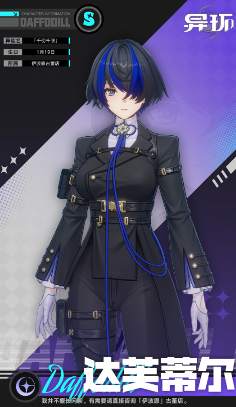 达芙蒂尔为暗属性异能输出角色,普攻为双刃五段斩击,附带暗属性异能伤害;长按普攻可向前突进,发动旋风急斩并在路径留下持续生效的印痕,对经过敌人造成额外伤害。“同振”技能初始为单体暗属性输出,当队伍中其他角色释放援护技时,该技能可叠加层数,每层提升基础伤害与“倾陷值”,叠满两层后技能形态进化,转为绳索缠绕+双刃轮斩,伤害类型仍为暗属性异能。“交刃”为瞬发单体暗属性异能技,无附加效果。“见此终幕”为范围暗属性异能终结技,命中后解放左眼,进入强化状态:期间自身所有伤害提升,同时对范围内全部敌人施加“洞察”状态,影响后续战术协同。