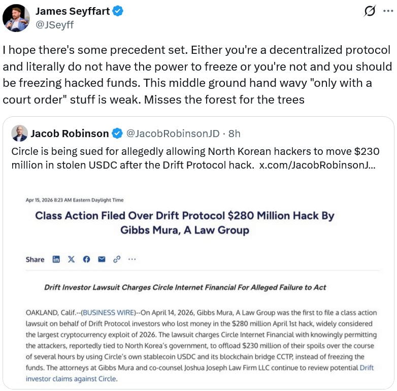 McCollum 的律师指出,在 Drift 事件发生前大约一周,Circle 冻结了 16 个 USDC 钱包,这与一起密封的美国民事案件有关,以此证明 Circle 有能力进行同样的操作。