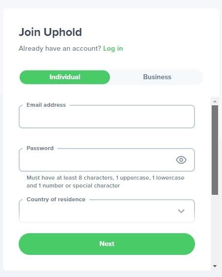 2. 其次,选择您想要个人帐户还是企业帐户。对于我们的 Uphold 审核指南,我们将注册一个个人帐户。