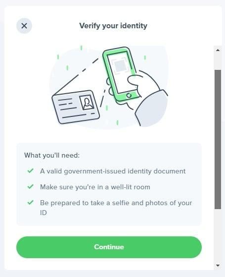 7. 在最后步骤中,您必须验证您的身份。只需拍摄政府颁发的身份证件和脸部的照片即可。系统将在后台 完成一个看不见的过程来验证您的身份。
