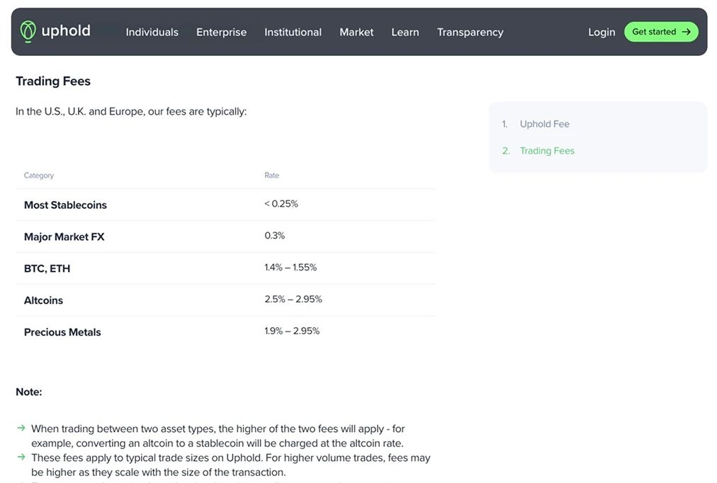 Uphold 以其透明的收费体系而自豪。虽然它不收取交易佣金,但会收取交易点差。该点差会根据市场行情和交易资产的不同而变化。
