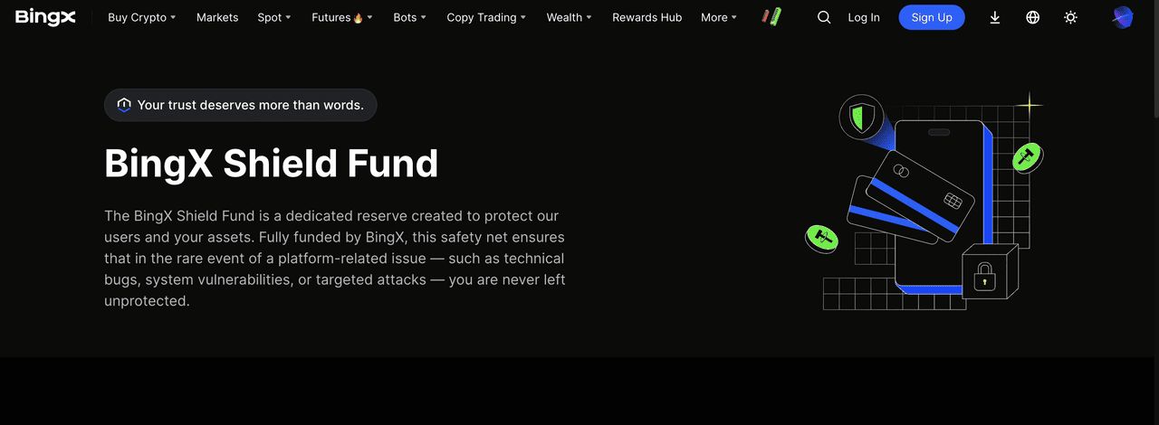 | BingX | 跟单交易、早期上市山寨币、AI驱动工具 | 1,000+种币 | 1.5亿+美元盾牌基金(由BTC、ETH、USDT支持),98%+冷存储,100%准备金证明(每月Merkle树审计),ISO 27001认证 | 现货:0.1%做市商/吃单商;期货:0.02%做市商/0.05%吃单商(通过VIP等级可进一步降低) |