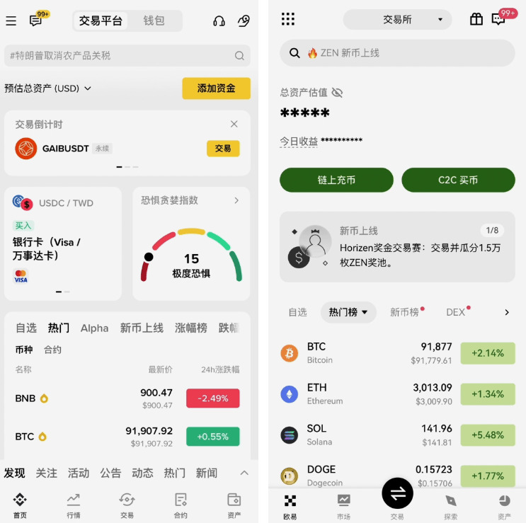 接下来我们再来看另外一个对比,就是哪个平台更好用。这里说的更好用是从用户交互体验上面来说的,准确来讲没有谁更好,只有你第一感觉是否适合自己。这里我们打开两个APP对比一下。左边是币安的,右边是欧易的。进去之后其实功能差不多,都比较类似,这是主页的。