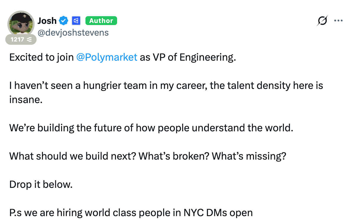 3 月 24 日,前 Aave 工程師、高級副總裁 Josh 发文宣布 加入 Polymarket。而在短短半個月後,其就已在個人帳號下 再次发文 招募工程師。看得出來,業務高速發展的 Polymarket 的開發者缺口遠比外界想像中的更大。