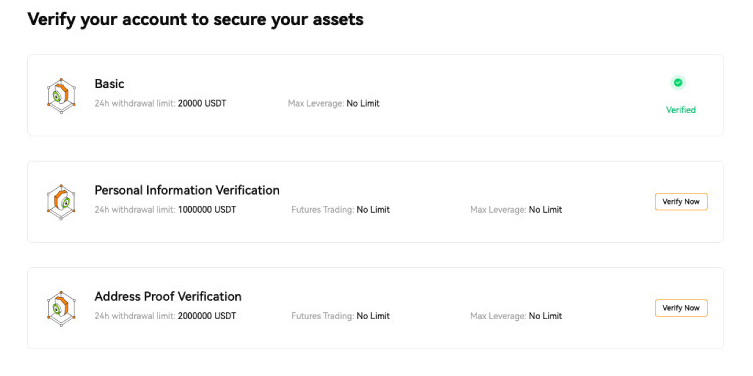 - 地址证明验证(等级 2):24 小时内提现限额增至 2,000,000 USDT。