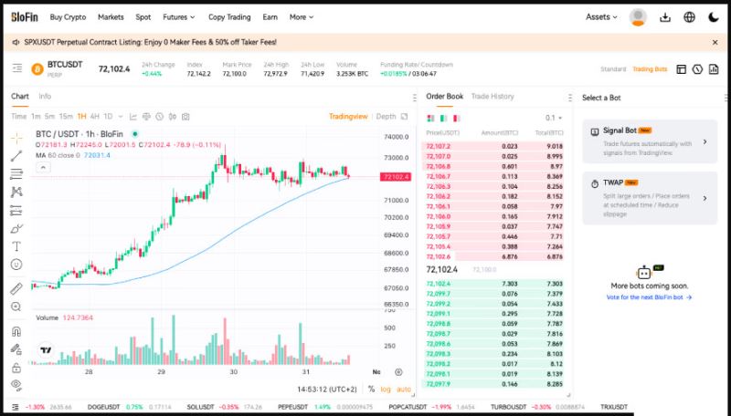 正如你从这部分 BloFin 评测中猜到的,期货交易的来龙去脉实在太多了!如果觉得必要的话,BloFin 还提供了交易机器人帮助你。交易机器人会根据预设条件自动执行交易。 比如,Signal Bot 就利用 TradingView 生成的信号数据,为你提供一些有价值的市场见解,帮助你做出更明智的决策。
