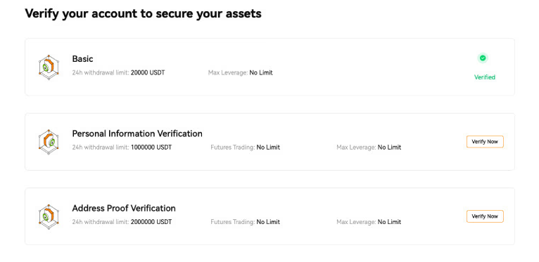 - 个人信息验证(等级 1):24 小时内提现限额提升至 1,000,000 USDT。