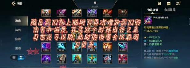 制服之刃:制服之刃是一件非常重要的装备,它可以帮助剑圣压制敌人,控场制胜。搭配剑圣的技能,制服之刃能够让剑圣在团战中发挥更大的作用。