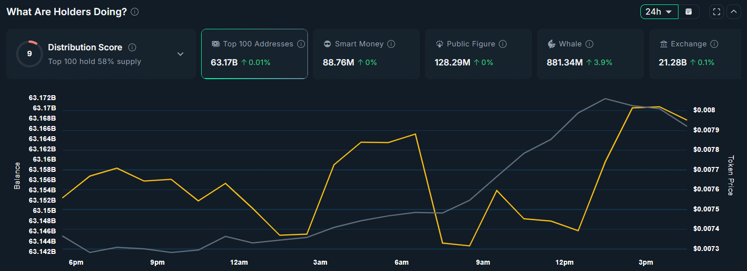 新錢包錄得價值327,000美元的模因幣流入——為過去24小時的平均值的兩倍。在同一時期,PENGU巨鯨也增加了881.89百萬枚代幣——相當於3.90%。