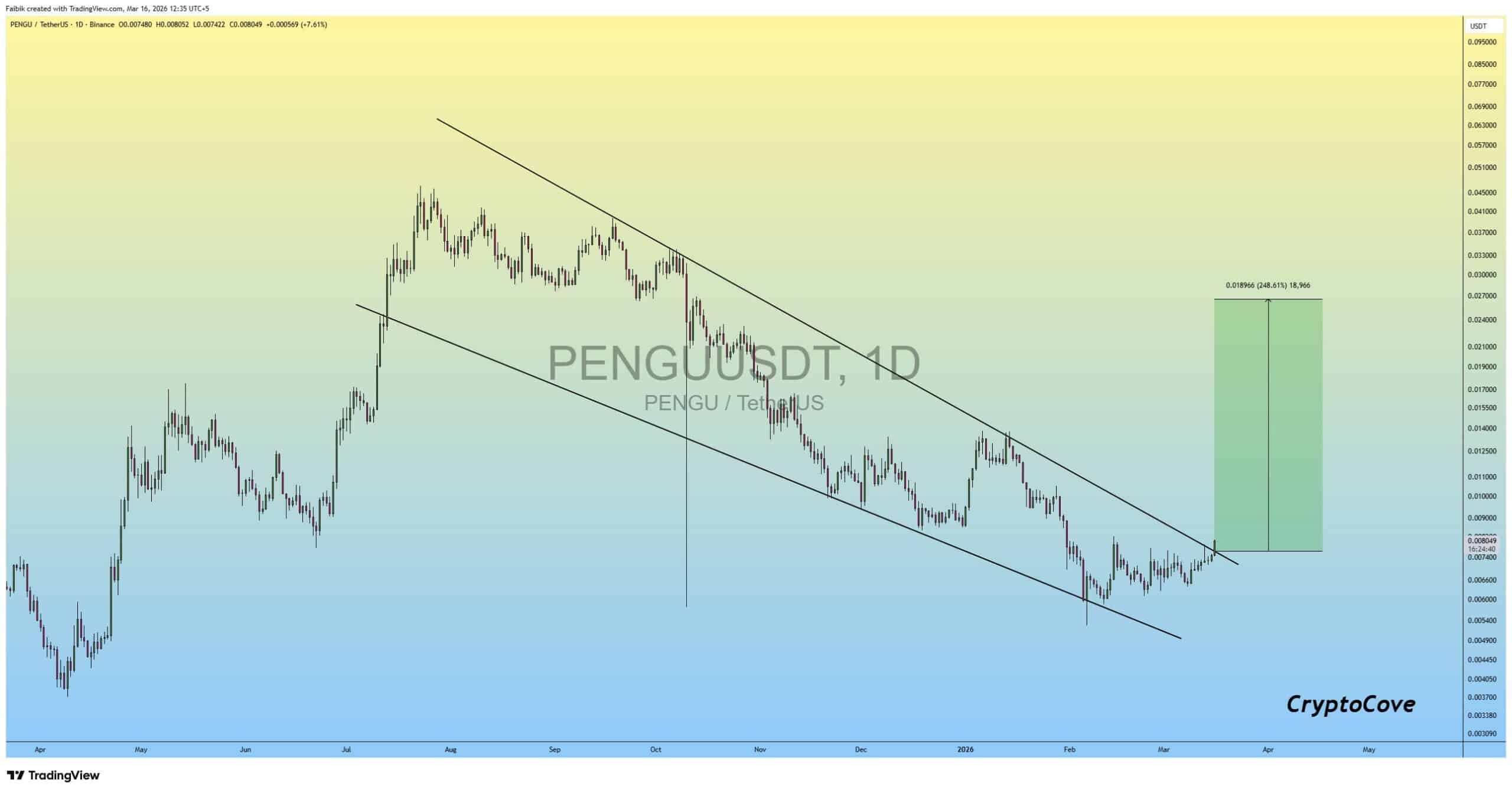 正如預期,這些發現引發了多項預測。在 X 上的一篇貼文中,一位專家分享了 PENGU 的日線圖,顯示該模因幣似乎正在突破一條長期的下降趨勢線。該專家指出,「預期將出現 +250% 的看漲反彈」。