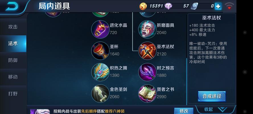 在第一次回城后,高渐离的核心装备之一是魔女斗篷,它能提供额外的法术攻击和法力值。虚无法杖的高法术攻击加成和穿透效果也是必备的。炽热支配宝石可以增加高渐离的法术吸血效果,提高生存能力。