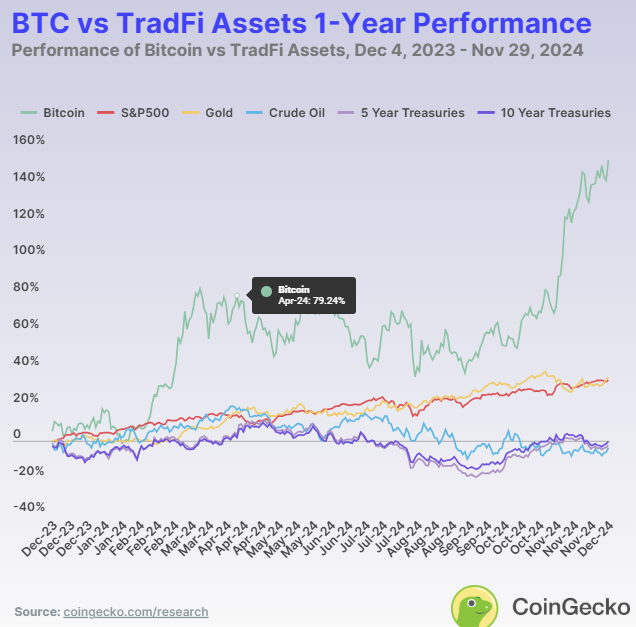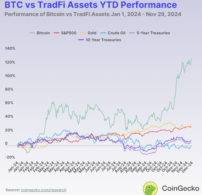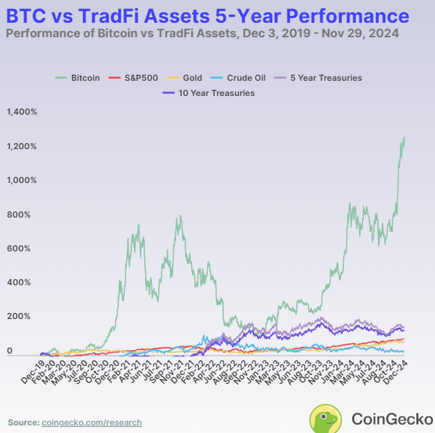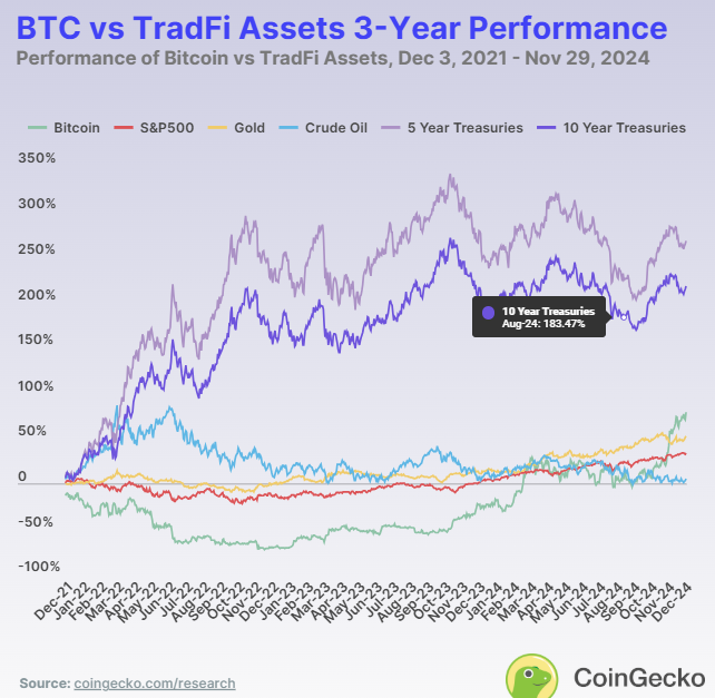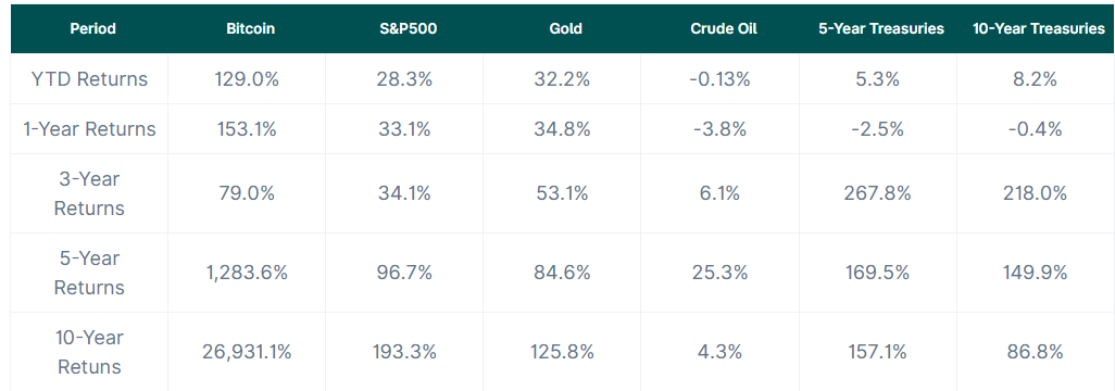 不同時間跨度的表現揭示了每種資產的優劣勢。在 2024 年,比特幣是表現最好的資產,回報率為 129.0%。黃金緊隨其後,年初至今回報率為 32.2%,展示了其作為傳統價值儲存手段的可靠性。標普 500 指數保持強勁,回報率為 28.3%。然而,原油價格下跌,回報率為 -0.13%,而美國國債提供了適度的回報,5 年期國債為 5.3%,10 年期國債略高,為 8.2%。