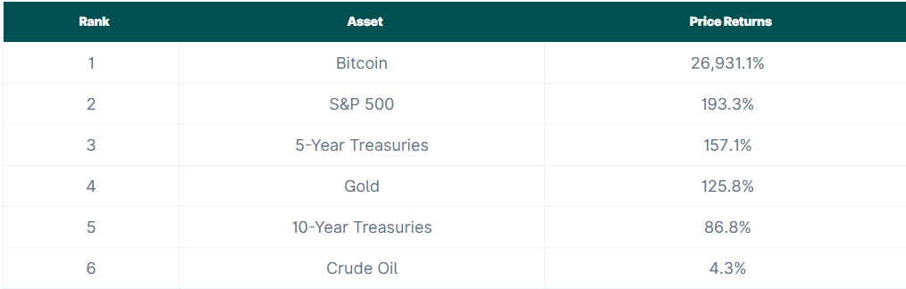 從長達十年的時間跨度來看,比特幣的增長率達 26,931.1%,無人能及,這充分證明了它對早期投資者的巨大投資潛力。儘管其他資產的回報率遠不及比特幣,但它們仍然能夠提供穩定的收益,例如標普 500 指數的回報率為 193.3%,黃金的回報率為 125.8%。美國國債也維持著價值,五年期國債的回報率為 157.1%,十年期國債的回報率為 86.8%。然而,原油的回報率僅為 4.3%,表現遠遜於其他資產。