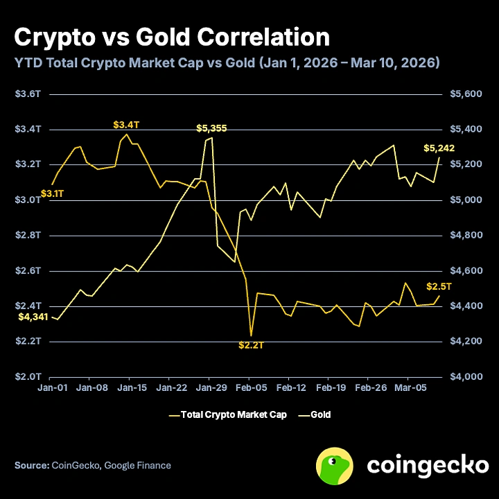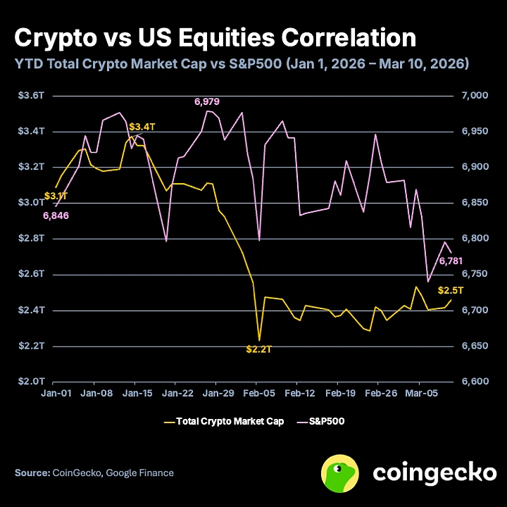 自 2026 年以來,加密貨幣與標普 500 及黃金僅顯示出中度相關性,或許是資產類別最終開始「脫鉤」的訊號。