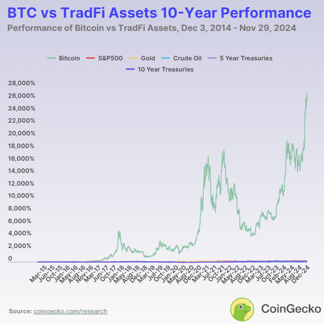 比特幣與傳統資產十年價格回報率對比如下: