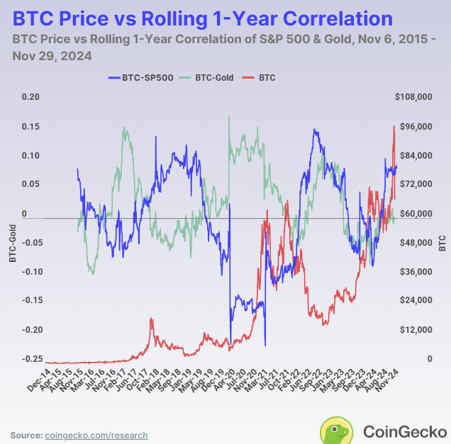 除了波動性,比特幣與標普 500 指數和黃金等其他主要資產的關係,可以進一步揭示其獨特的行為。相關性分析揭示了比特幣如何與傳統市場保持同步或脫節: