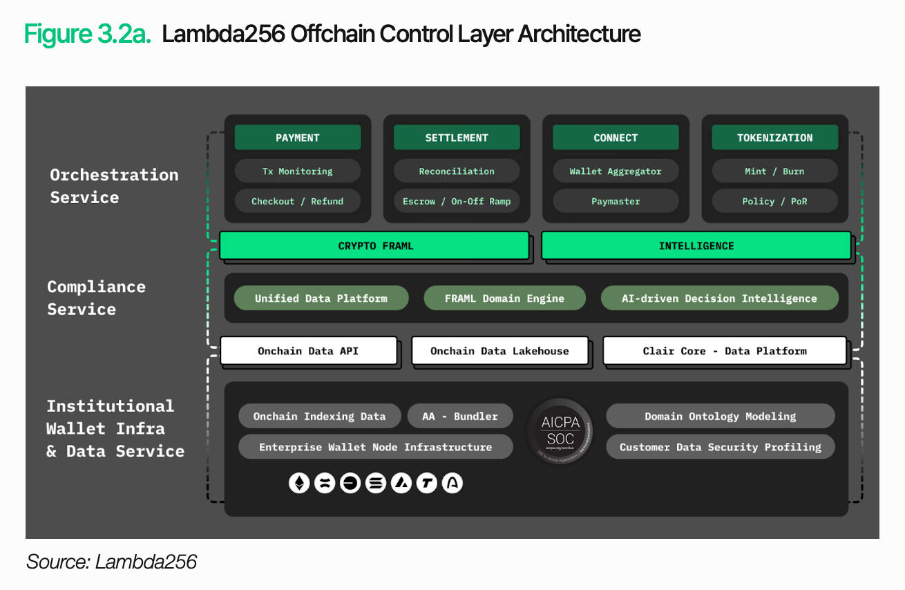 Lambda256 的技術棧由兩層組成:鏈上存取層和鏈下控制層。鏈上存取層負責收集和處理來自多個區塊鏈的數據和交易,並將其轉換為現有系統可使用的格式。鏈下控制層則負責在傳統金融運營框架內處理和管理這些數據。該架構的核心在於將區塊鏈交易與機構工作流程連接起來。Lambda256 以中間件的形式提供這些功能,使金融機構能夠將數位資產基礎設施與現有系統整合,從而實現數位資產基礎設施的部署。金融機構既能利用鏈上優勢,又能維持現有框架內的運營和控制,從而減輕基礎設施負擔,並更專注於核心業務。