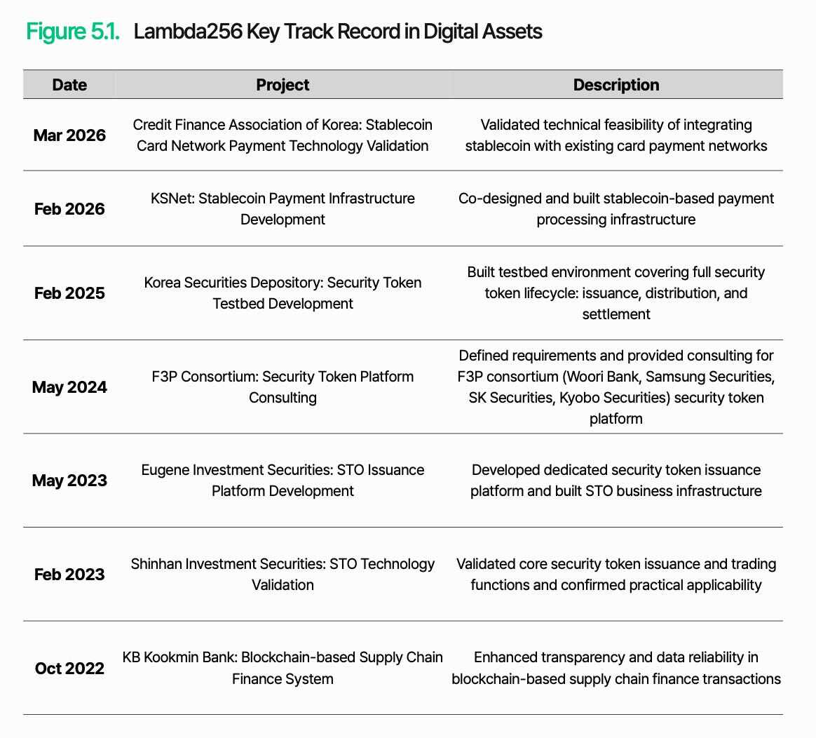 如前所述,數位資產普及的核心挑戰在於如何在現有金融系統中處理和管理基於區塊鏈的交易。Lambda256 為此提供了一套統一的金融中間件。作為 Upbit 運營商 Dunamu 旗下的區塊鏈技術子公司,Lambda256 構建了一套統一的數位資產普及技術棧,並擁有大規模的基礎設施運營經驗和豐富的概念驗證(PoC)經驗。
