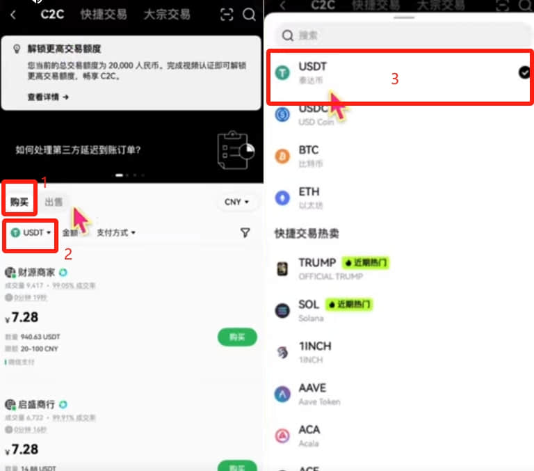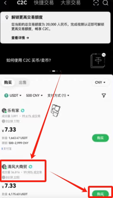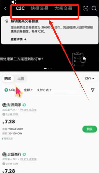 在上方有三个区域,分别是C2C、快捷交易和大宗交易。我们平时都是使用C2C交易的,因为他是个人对个人交易。
