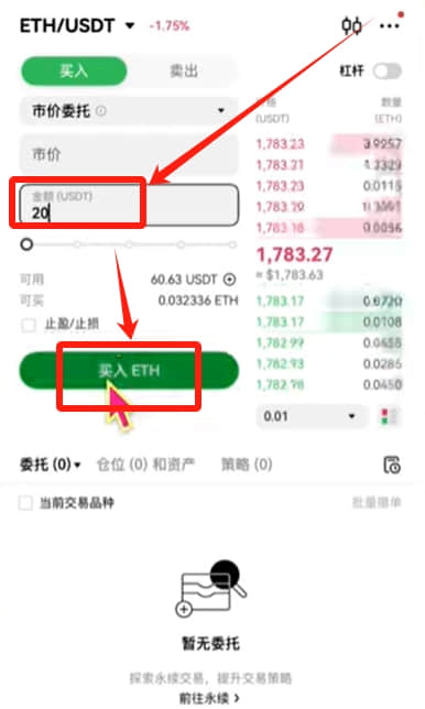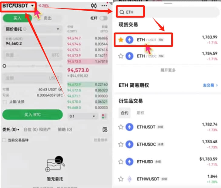 划转完成之后,我们就可以去交易其他的虚拟货币了。可以点击中间的交易按钮,然后在上方这里搜索想要交易的币种,比如说我想交易ETH,我就搜索EHT然后选择“ETH/USDT”。就是我们使用USDT去兑换EHT。