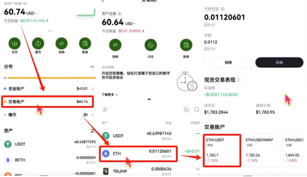 我们回到资产页面,选择【交易账户】,在这里就可以看到我们购买好的以太坊了。