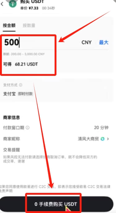 再次输入一下我们要购买的金额,他会为我们算出来支付500人民币,将收到68.21颗USDT。点击【0手续费购买USDT】。