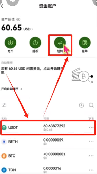 在这里就可以看到我们购买好的USDT了。如果你想用USDT去交易其他的虚拟货币该怎么办呢?首先点击上方的【划转】。