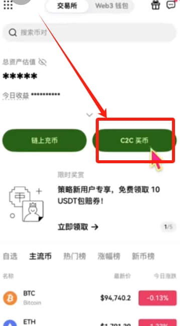 来到欧易的首页,我们想要去交易,想要去买币的话,就点击首页的【C2C买币】。