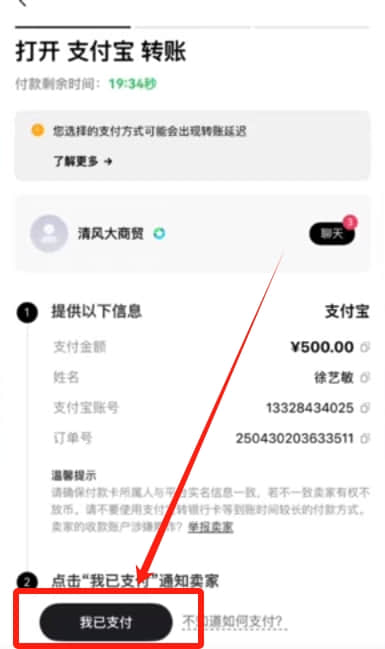 我们根据商家提供的支付方式给他转钱,转完钱之后点击【我已支付】,等待卖家核实收到钱之后就会把币放给我们了。