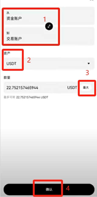 从资金账户到交易账户,币种选择USDT,全部划转,点击【确认】。