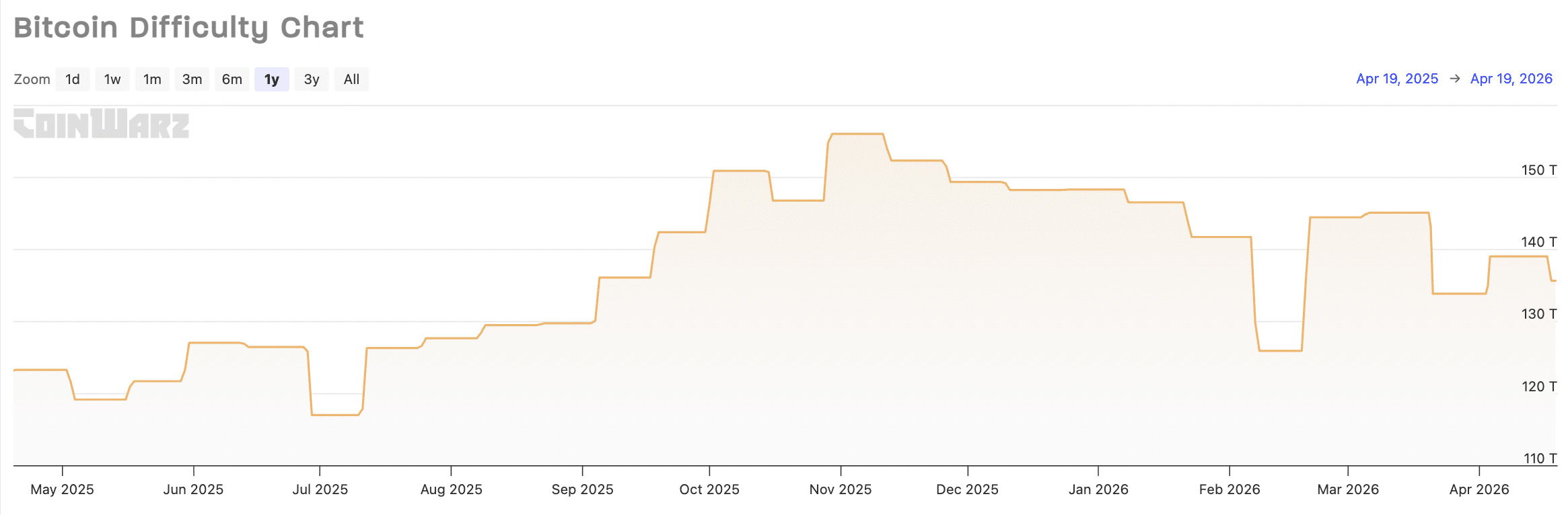 4 月 19 日,比特幣挖礦難度在過去 24 小時內下降 1.13% 後,降至 135.59 萬億。簡單來說,比特幣礦工需要比原始基準(2009 年設定為 1)多進行 135.59 萬億倍的工作量,才能找到一個區塊。